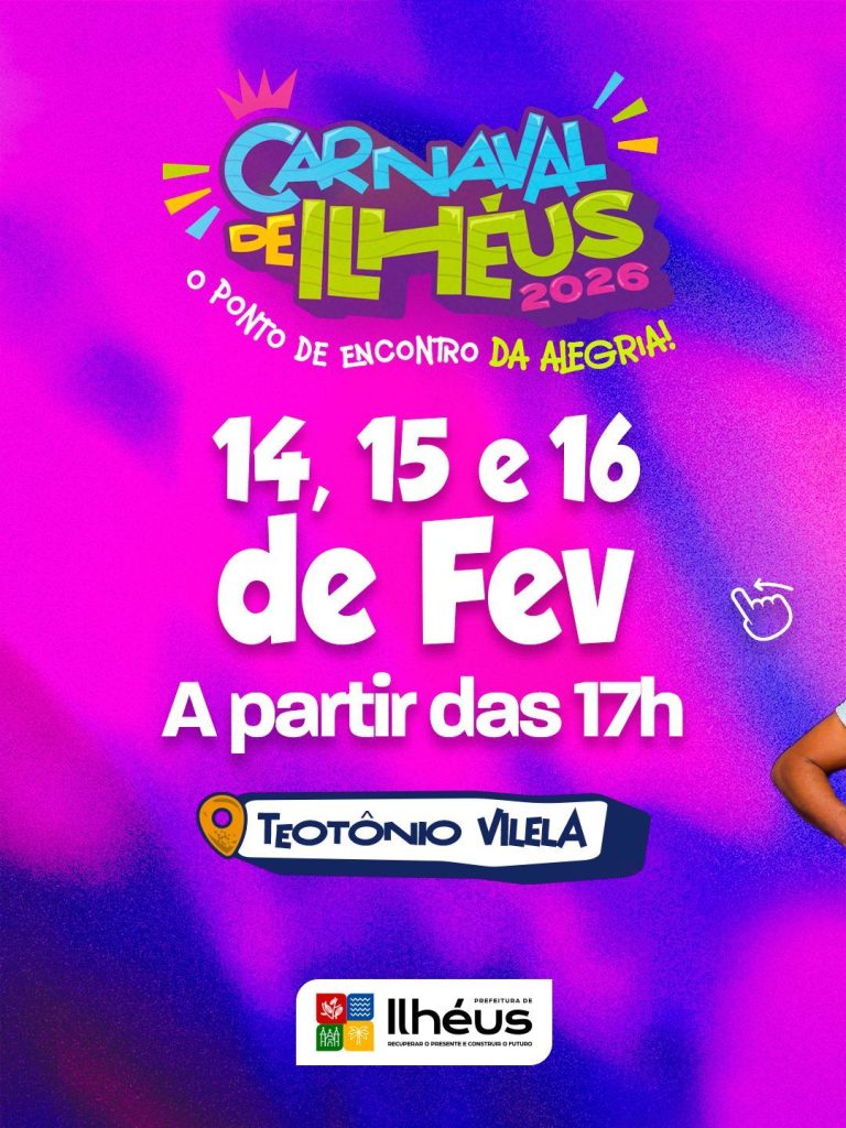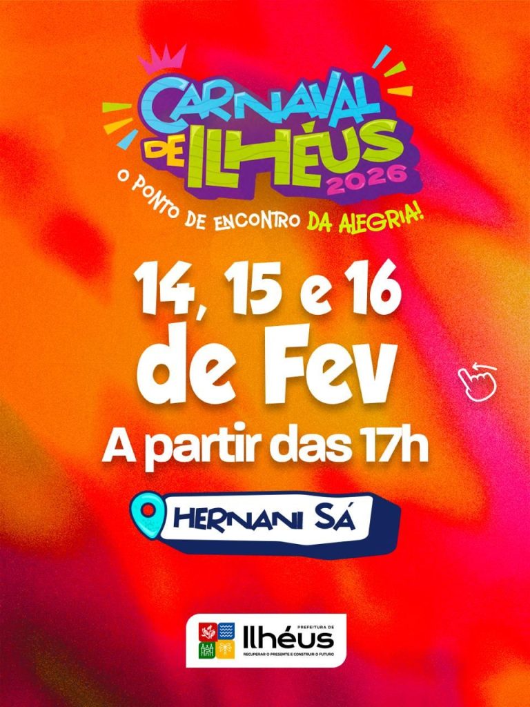 O Carnaval Ilhéus 2026 será marcado pela valorização da cultura, da diversidade e pelo fortalecimento da festa nos bairros. Com apoio aos blocos de rua e uma programação especial em dois circuitos oficiais, a Prefeitura reforça a essência da folia ilheense e da maior manifestação popular do país. Os foliões poderão curtir três noites de atrações, de sábado a segunda-feira, em palcos montados nos bairros Teotônio Vilela e Hernani Sá.