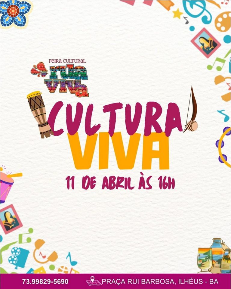 A Prefeitura de Ilhéus, por meio da Secretaria de Cultura, apoia mais uma edição da Feira Cultural Rua Viva, que será realizada neste sábado (12), a partir das 16h, na Praça Rui Barbosa. O evento ocorre todo segundo sábado do mês e já se consolidou como um espaço de valorização da cultura local e incentivo à economia criativa.