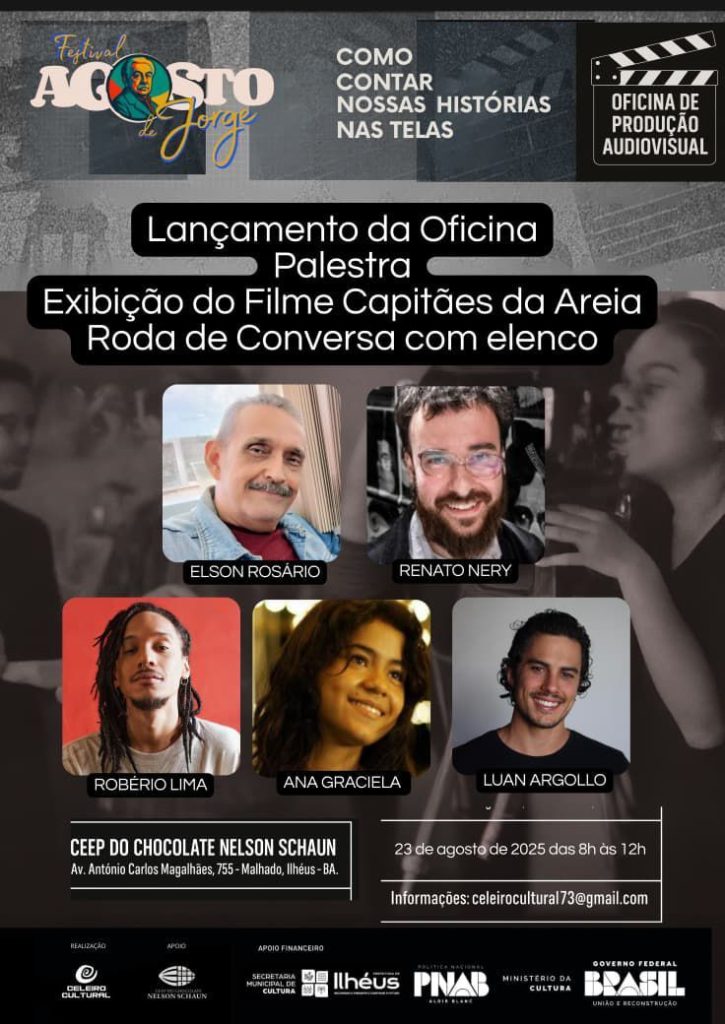 O destaque da manhã será a exibição do filme “Capitães da Areia”, dirigido por Cecília Amado, neta do autor, seguida de uma roda de conversa com a atriz Ana Graciela (Dora), o ator Roberio Lima (Professor) e o ator e preparador de elenco ilheense Luan Argolo (TV Globo/RecordTV).