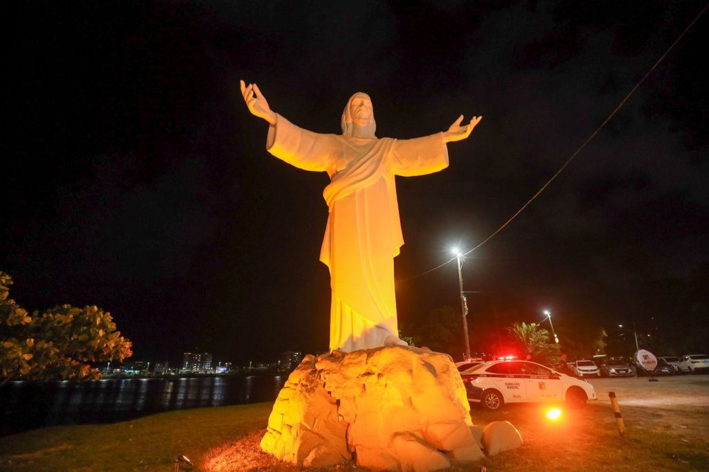 Cristo Redentor recebeu iluminação especial em iniciativa promovida pela Sociedade Brasileira de Dermatologia com apoio da Prefeitura de Ilhéus