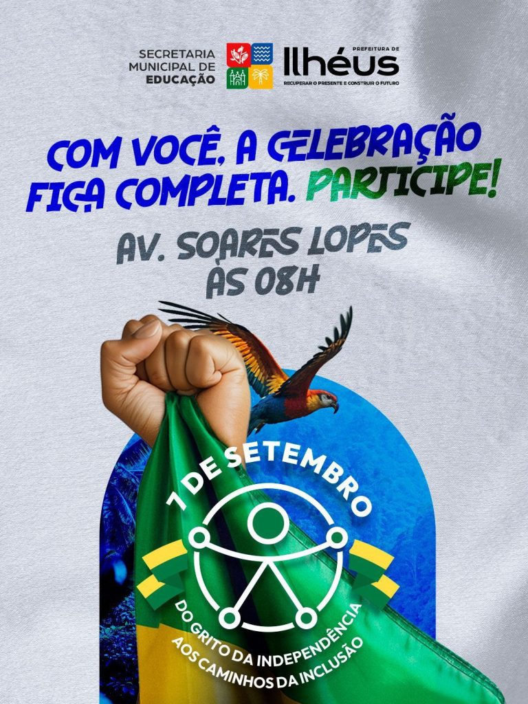A Prefeitura de Ilhéus realiza, neste domingo (7), o tradicional Desfile Cívico em comemoração à Independência do Brasil. O evento será realizado na Avenida Soares Lopes, com concentração a partir das 08h, em frente à Biblioteca General Osório.