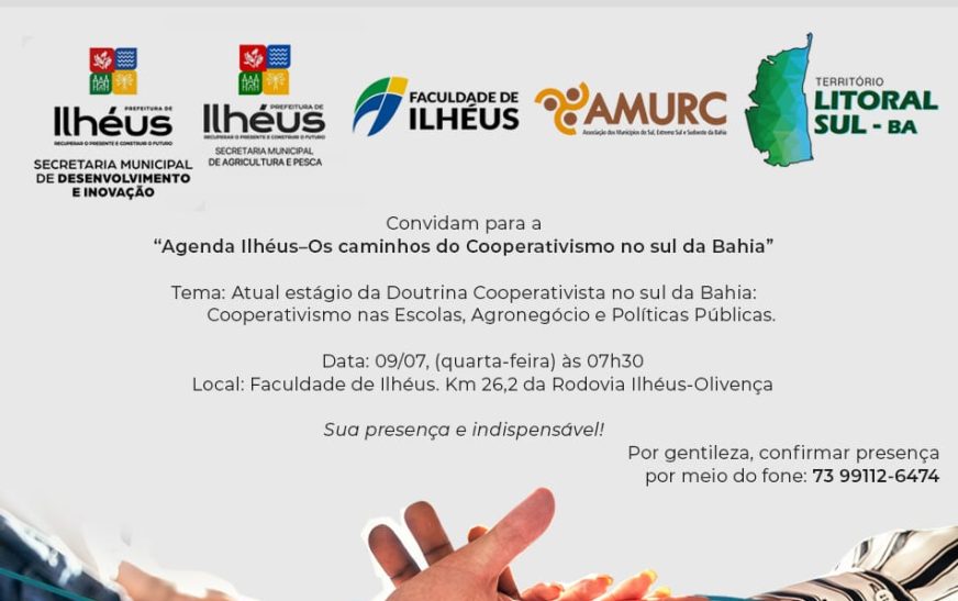 A Prefeitura de Ilhéus, por meio da Secretaria Municipal de Desenvolvimento Econômico e Inovação, promoverá, na próxima quarta-feira (09), o encontro técnico “Agenda Ilhéus – Os caminhos do Cooperativismo no sul da Bahia”. O evento acontecerá na Faculdade de Ilhéus e contará com a participação de especialistas, representantes de cooperativas e lideranças regionais.