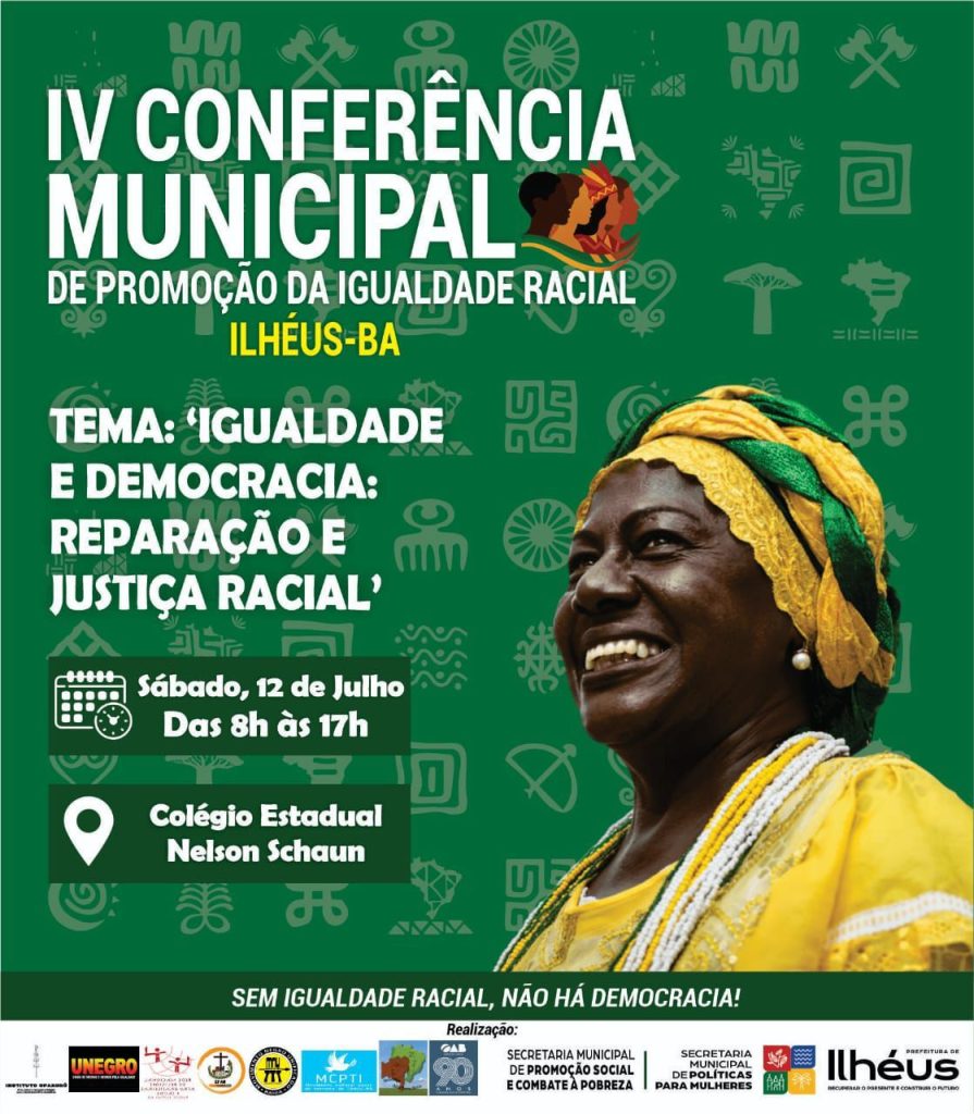 A Prefeitura de Ilhéus, por meio da Secretaria Municipal de Promoção Social e Combate à Pobreza e da Secretaria de Políticas para Mulheres, em parceria com os Coletivos de Militância Negra de Ilhéus-BA, realiza, neste sábado (12), a IV Conferência Municipal de Promoção da Igualdade Racial.