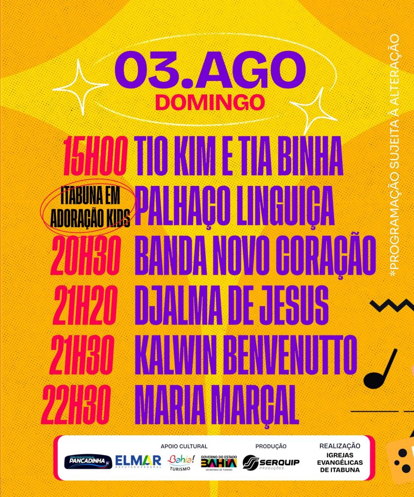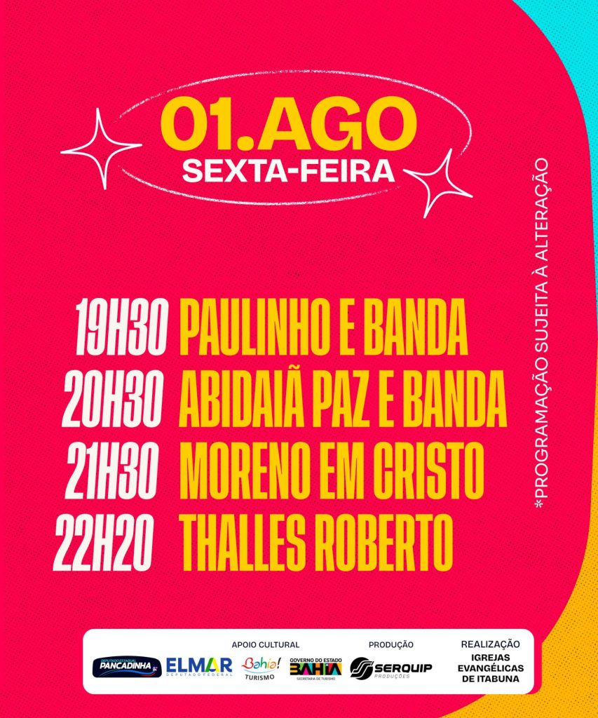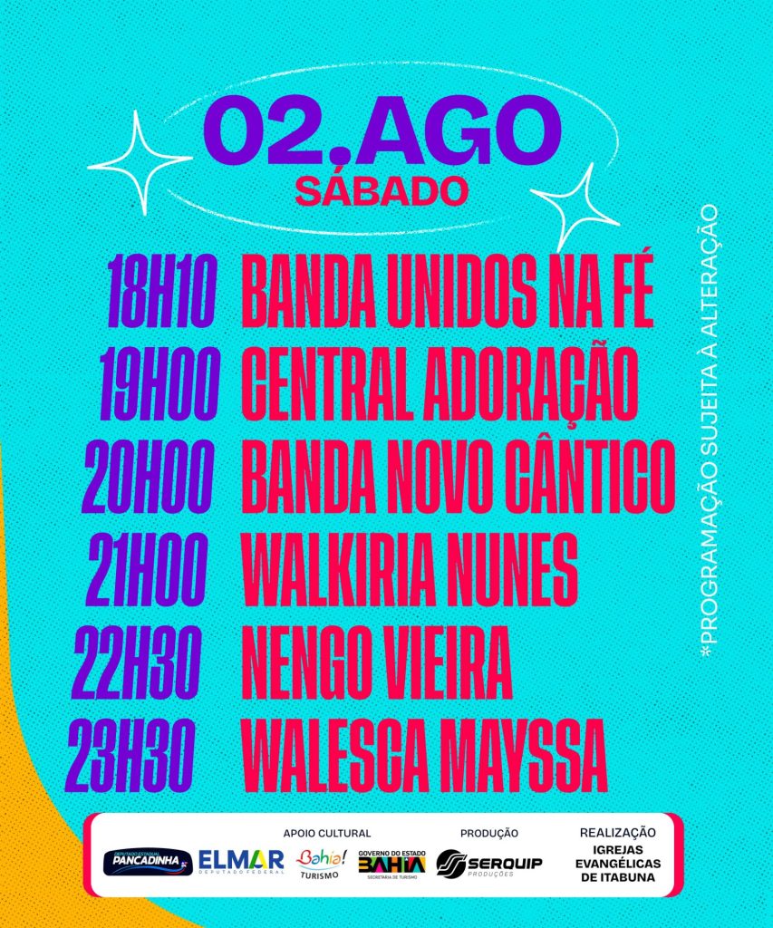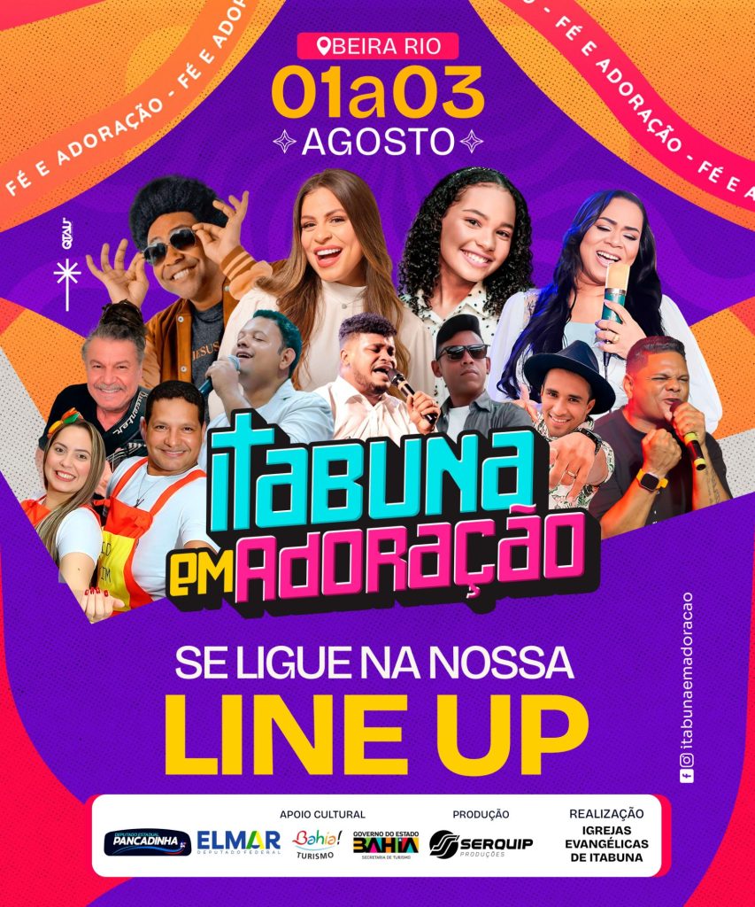Grande evento evangélico que vai acontecer nesse final de semana, nos dias 1,2 e 3 de agosto de 2025,será realizado na beira rio, na cidade de itabuna,vai ser 3 dias com várias programações e bandas nacionais e da região, você não pode ficar de fora