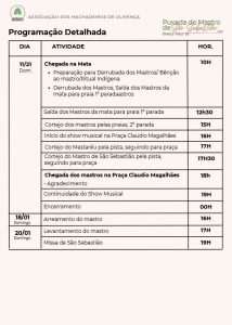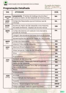 Com mais de 300 anos de história, a Puxada do Mastro marca oficialmente o início das comemorações em honra a São Sebastião. A programação envolve cortejo tradicional, lavagem das escadarias, apresentações culturais, missa, procissão e shows musicais. No domingo (11), o público contará com o show do cantor Nadson O Ferinha, já anunciado pelo prefeito Valderico Junior, que promete animar moradores e visitantes.