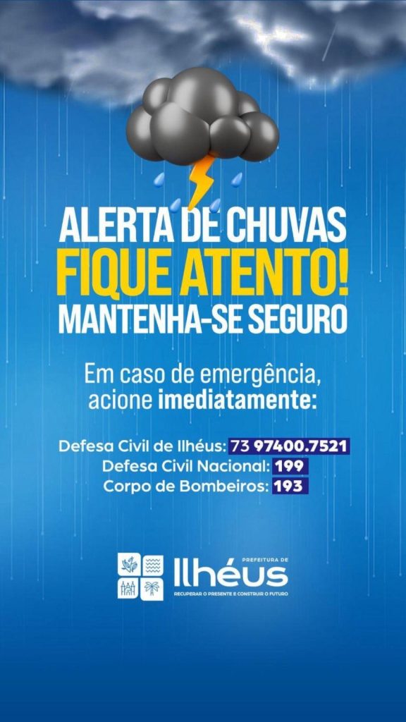 A Seinfra reforça a orientação para que os moradores fiquem atentos a sinais de deslizamentos de terra, rachaduras em imóveis, inclinação de postes ou árvores e outras situações de risco, especialmente em áreas mais vulneráveis. Em caso de emergência, a população deve acionar imediatamente a Defesa Civil de Ilhéus pelo número (73) 97400-7521, a Defesa Civil Nacional, pelo 199, ou o Corpo de Bombeiro, número 193.