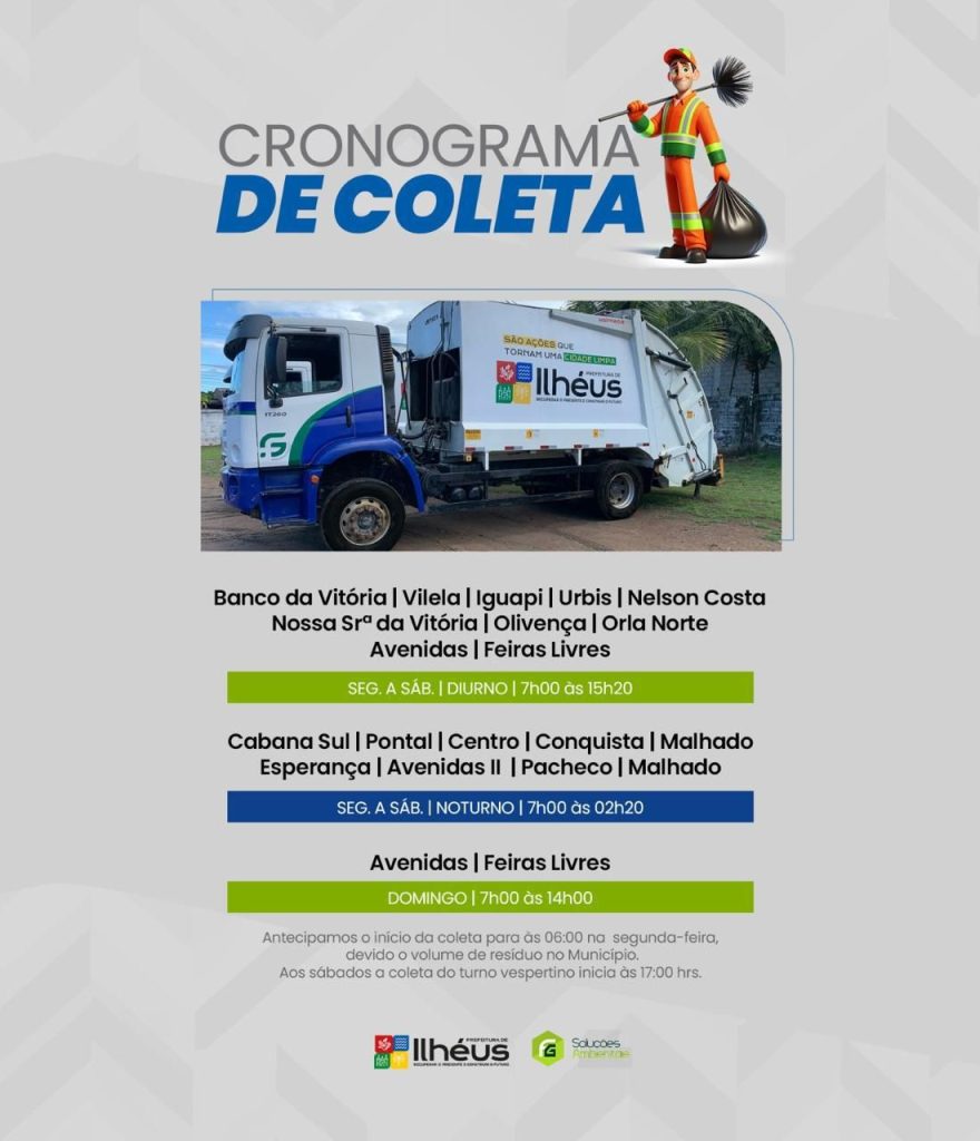 A Prefeitura de Ilhéus, por meio da Secretaria de Serviços Urbanos, está reforçando o alerta para que os moradores coloquem o lixo na rua apenas nos horários estabelecidos para coleta em seus respectivos bairros. O descarte fora do horário pode gerar sérios problemas, como ruas sujas, entupimento de bueiros e atração de animais, como ratos, cães e urubus.