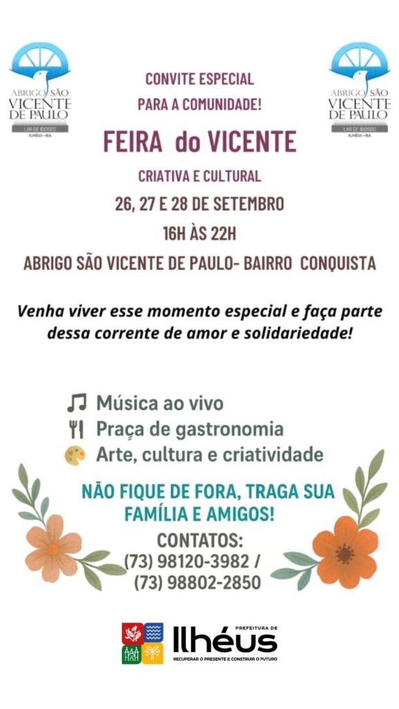 A Prefeitura de Ilhéus é parceira da Feira Criativa e Cultural do Vicente, evento realizado pelo Abrigo São Vicente de Paulo, no bairro Conquista. A programação acontece nos dias 26, 27 e 28 de setembro, das 16h às 22h, reunindo arte, música e gastronomia em um ambiente aberto ao público.
