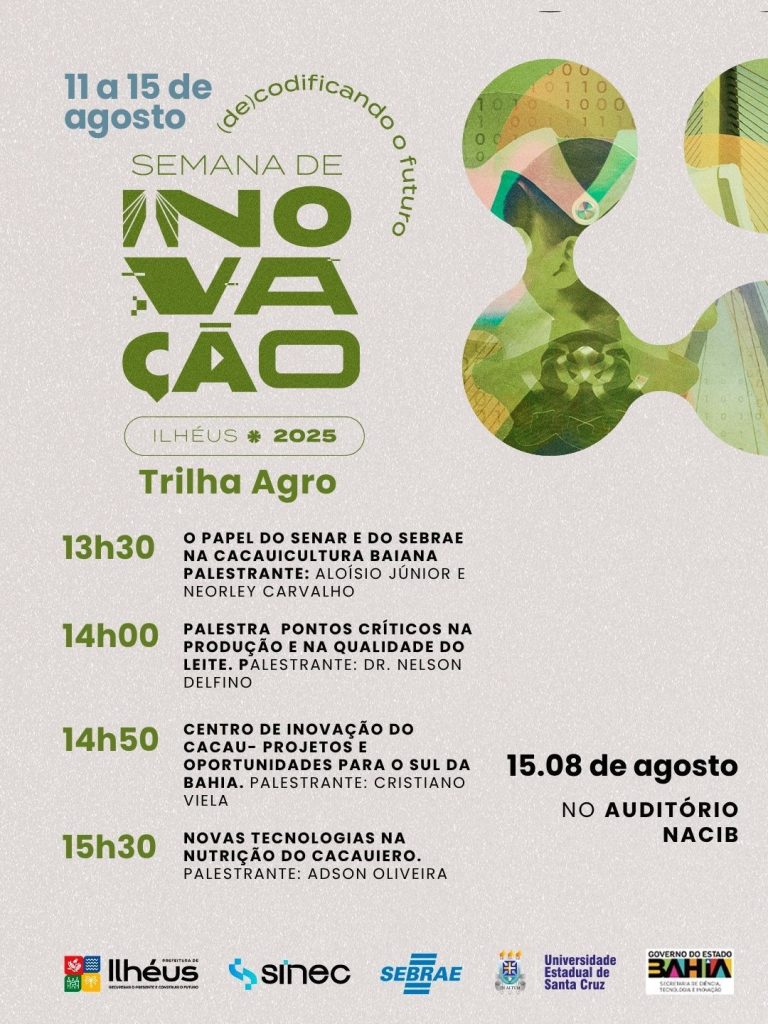 A Prefeitura de Ilhéus, em parceria com o Sebrae, realizou nesta sexta-feira (15), uma programação especial voltada para o setor de agricultura e pesca, dentro da Semana de Inovação do município. O encontro aconteceu no Auditório do NACIB e contou com a presença de produtores, estudantes, pesquisadores e autoridades ligadas ao agro.