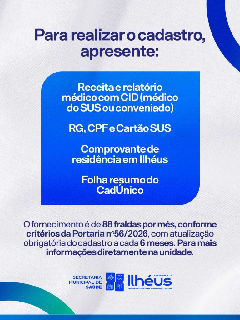 A Prefeitura de Ilhéus, por meio da Secretaria Municipal de Saúde, através da coordenação da Farmácia Pública, informa que, a partir da próxima segunda-feira (02/03), o cadastro e a distribuição de fraldas descartáveis passarão a ser realizados no Posto Herval Soledade, localizado no bairro do Pontal.