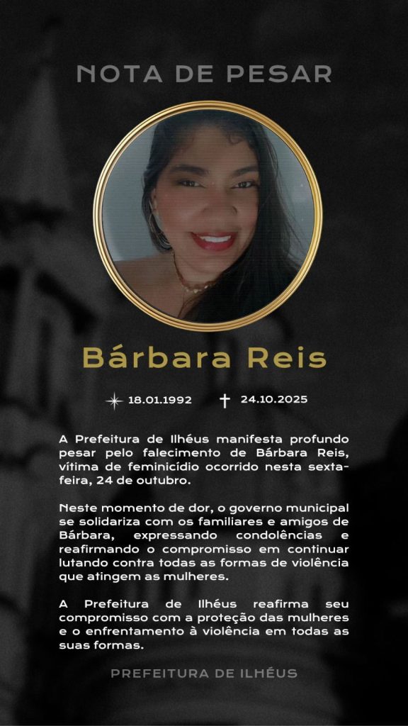 A Prefeitura de Ilhéus, por meio da Secretaria de Políticas para as Mulheres, manifesta profundo pesar pela morte de Bárbara Reis, de 32 anos, vítima de feminicídio ocorrido nesta sexta-feira, 24 de outubro.