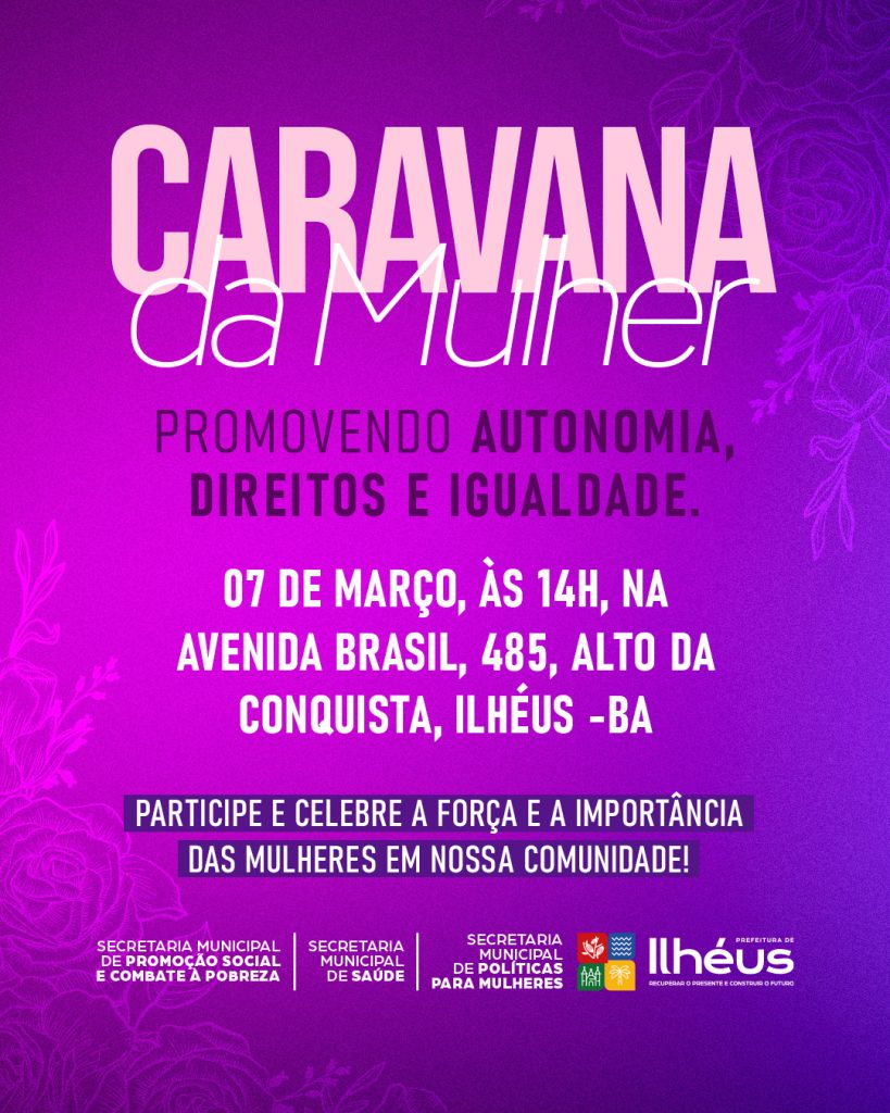 Iniciativa integra a programação do Mês da Mulher e oferece serviços gratuitos no dia 7 de marçoA Prefeitura de Ilhéus, por meio da Secretaria de Políticas para as Mulheres, em parceria com a Secretaria de Promoção Social e Combate à Pobreza e a Secretaria de Saúde, realiza mais uma edição da Caravana da Mulher, desta vez no bairro Conquista. A ação, que integra as atividades do Mês da Mulher, ocorre no dia 7 de março, às 14 horas, na Avenida Brasil, número 485. O objetivo é facilitar o acesso das mulheres a serviços básicos de saúde e regularizar benefícios sociais diretamente no bairro.No local, serão ofertados serviços como consulta médica, vacinação, testes rápidos de saúde e a pesagem obrigatória do Bolsa Família. Para participar, basta levar documento de identidade e cartão do SUS.A iniciativa busca promover a saúde e a cidadania das mulheres ilheenses, garantindo acolhimento, informação e acesso democrático a serviços essenciais.