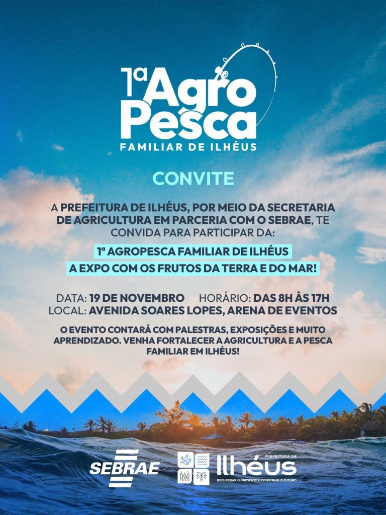 A Prefeitura de Ilhéus, por meio da Secretaria de Agricultura e Pesca, em parceria com o Sebrae, realiza a 1ª AgroPesca Familiar de Ilhéus, no dia 19 de novembro, das 8h às 17h, na Avenida Soares Lopes, na Arena de Eventos. A exposição vai destacar o potencial produtivo do município, reunindo os frutos da terra e do mar em um grande encontro de aprendizado, troca de experiências e valorização do trabalho local.