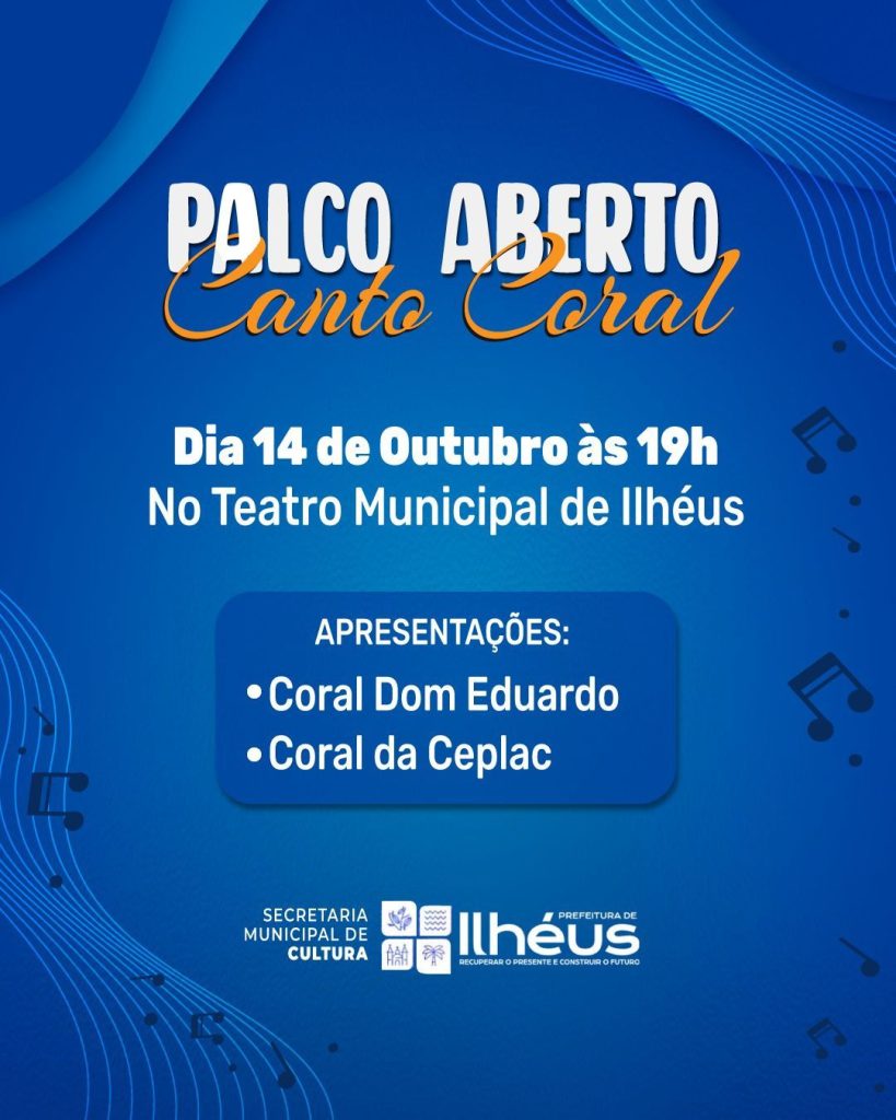 A Prefeitura de Ilhéus, por meio da Secretaria de Cultura, realiza mais uma edição do projeto Palco Aberto Canto Coral, que acontece nesta terça-feira (14), às 19h, no Teatro Municipal de Ilhéus.