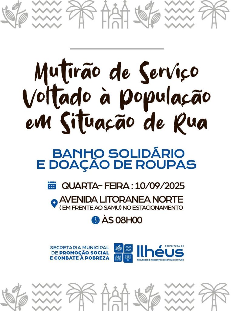 A Prefeitura de Ilhéus, por meio da Secretaria Municipal de Promoção Social e Combate à Pobreza, realiza nesta quarta-feira (10), a partir das 8h, um mutirão de serviços voltado à população em situação de rua. A iniciativa acontece no estacionamento em frente ao SAMU, na Avenida Luis Eduardo Magalhães (Litorânea Norte).
