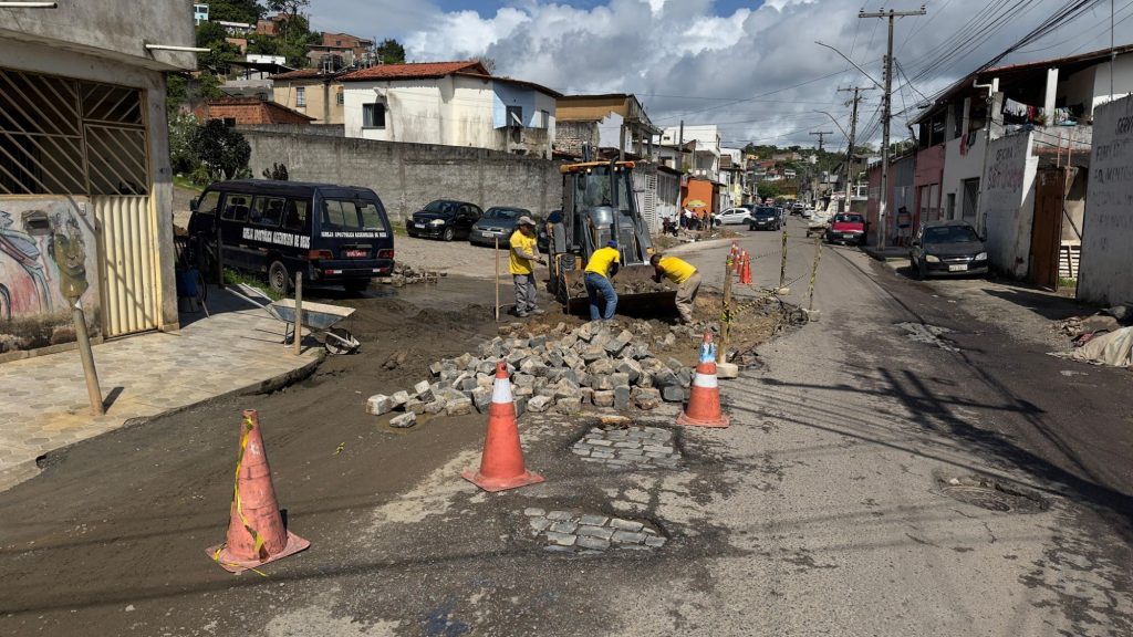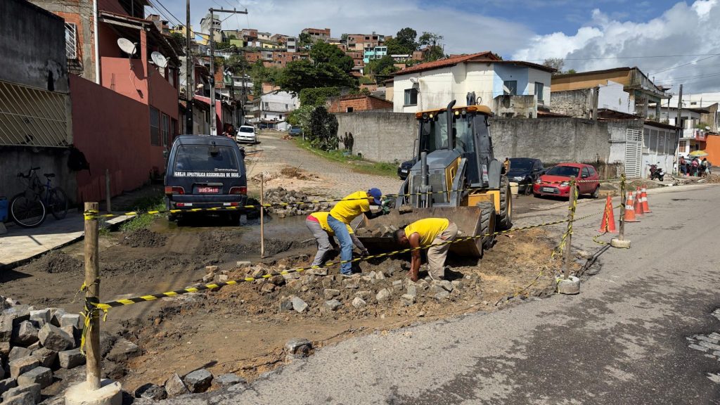 O trecho afetado estava parcialmente interditado devido a um afundamento provocado pela quebra de manilhas antigas. Com a substituição das estruturas danificadas, os trabalhos já avançaram para a fase de reassentamento dos paralelepípedos, etapa que antecede a finalização com pavimentação asfáltica.