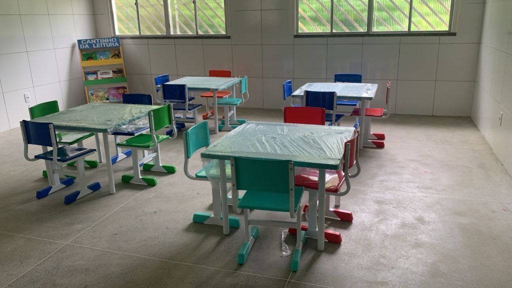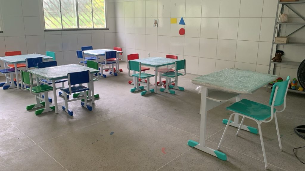 No anexo da unidade escolar, o novo mobiliário é destinado à educação infantil e inclui mesas e cadeiras, além de kit completo para professor. A iniciativa proporciona mais conforto, organização e melhores condições de aprendizagem para as crianças.