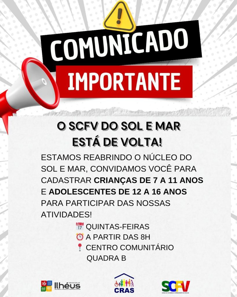 A Prefeitura de Ilhéus, por meio da Secretaria Municipal de Promoção Social e Combate à Pobreza, anuncia a reabertura do núcleo do Serviço de Convivência e Fortalecimento de Vínculos (SCFV) no Residencial Sol e Mar.