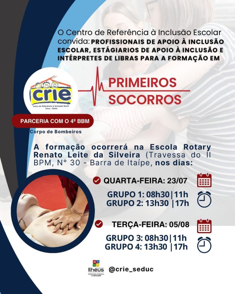 A Prefeitura de Ilhéus, através da Secretaria Municipal de Educação, com apoio do Centro de Referência à Inclusão Escolar (CRIE) e do 4º Batalhão de Bombeiros Militar (BBM), promove uma formação em primeiros socorros voltada para profissionais de apoio à inclusão escolar, estagiários da área e intérpretes de Libras.