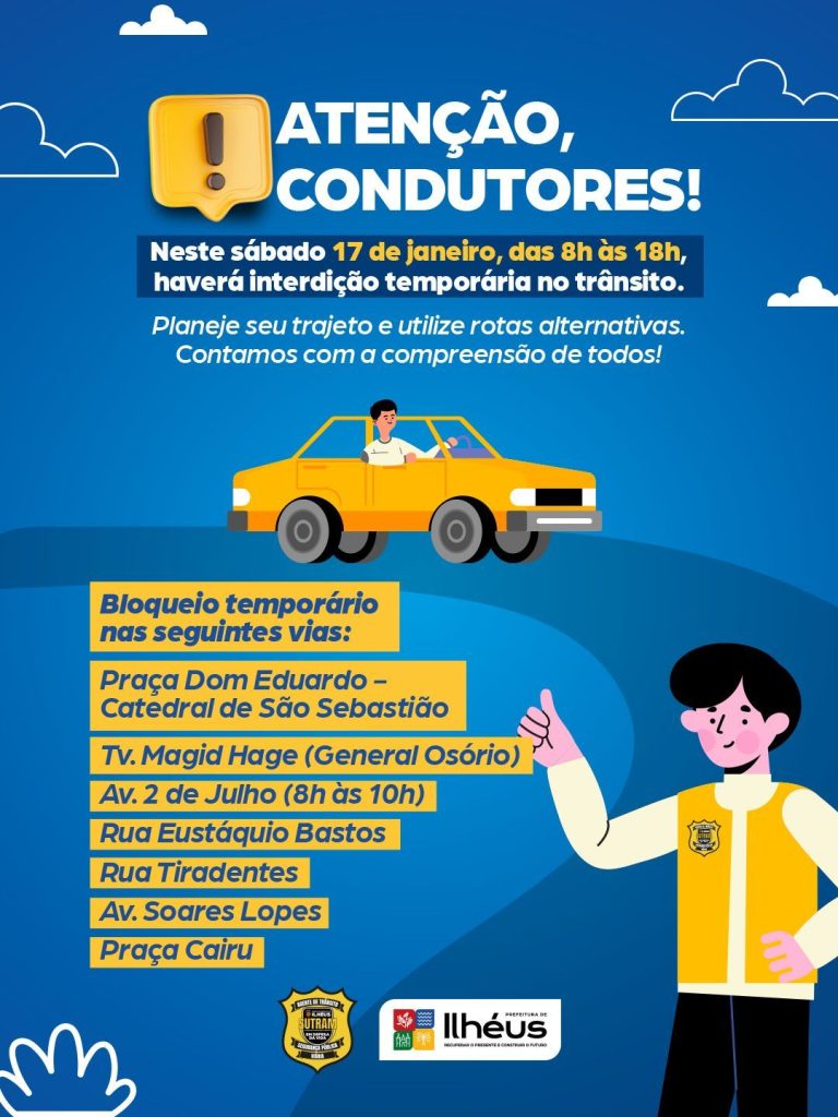 Interdições temporárias e controle de circulação serão realizados no Centro de Ilhéus neste sábado (17)
