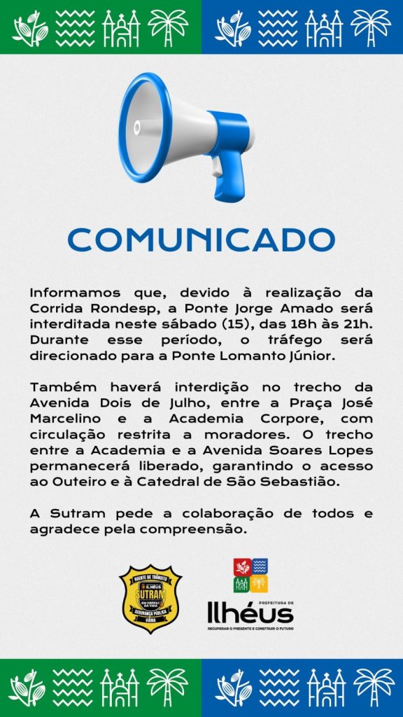 A Prefeitura de Ilhéus, por meio da Autarquia de Transporte e Trânsito (Sutram), informa que neste sábado (15) a Ponte Jorge Amado será fechada em ambos os sentidos para a realização da 3ª Rondesp Sul Night Run. O bloqueio do tráfego terá início às 18h, com previsão de liberação às 21h.